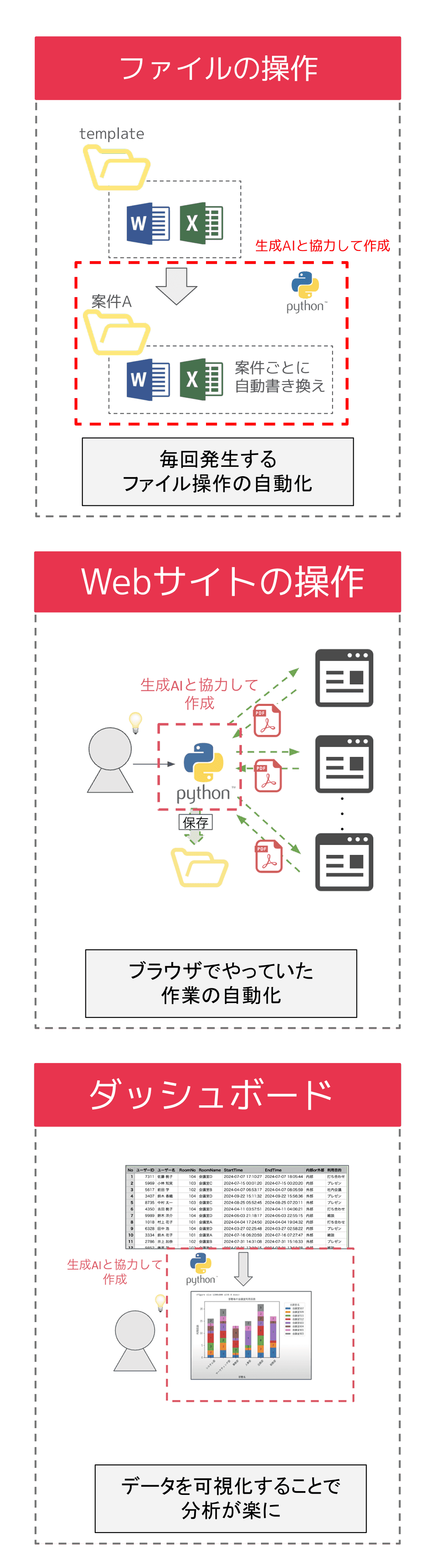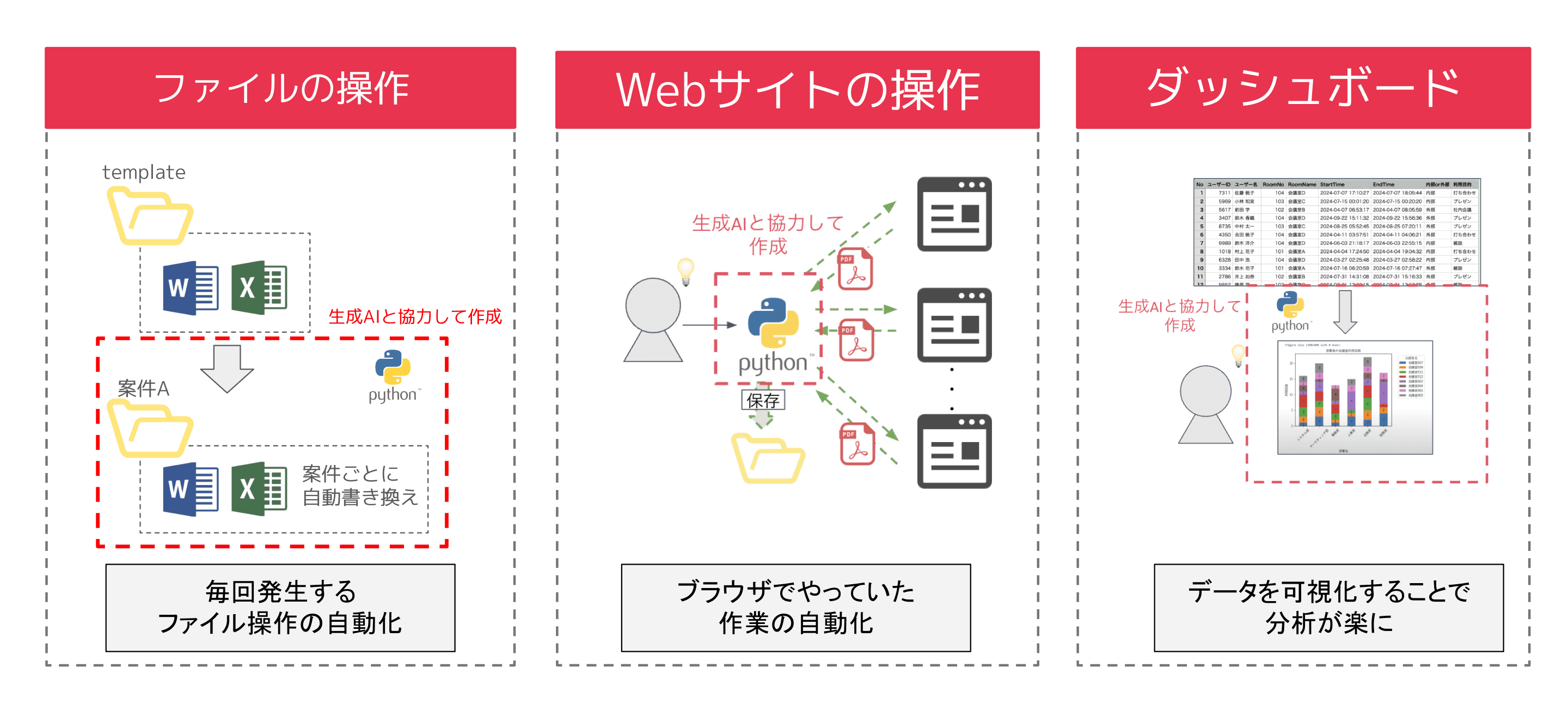 Pythonプログラミングを基礎から学び、生成AIを活用して効率的に業務自動化ツールが作れるようになる。